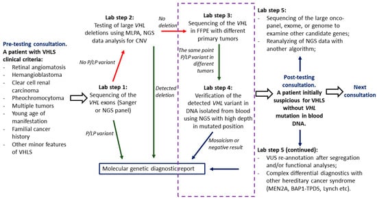 - Analysis of VHL in tumors and subsequent re-analysis of DNA sequencing data from blood or a new NGS test with high coverage of the variant localization to detect the mosaic form of VHLS.