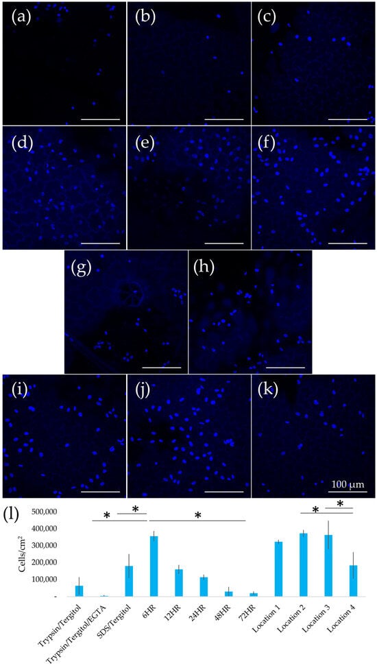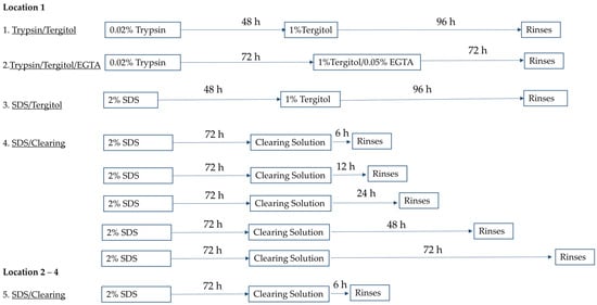 - Trypsin/Tergitol/EGTA: Samples were treated for 72 h in 0.02% Trypsin, followed by 72 h 1% Tergitol and 0.05% EGTA (Sigma-Aldrich) in deionized water, with solutions refreshed every 24 h.