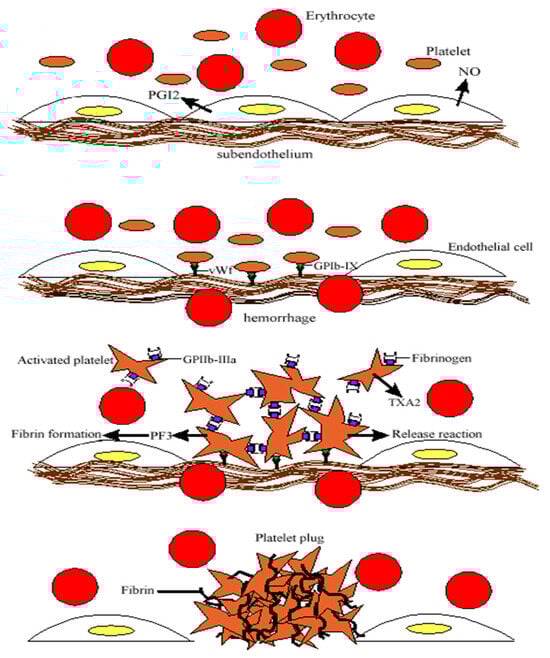 Arterial thrombosis primarily occurs following endothelial damage, which can be triggered by vascular injury or the rupture of atherosclerotic plaques, especially under high-shear stress conditions. When the endothelium is compromised, circulating platelets are rapidly decelerated and temporarily interact with exposed subendothelial matrix components, including immobilized von Willebrand factor (vWF) and collagen types I, III, and VI. The vWF–collagen interaction facilitates the initial tethering of platelets to the vessel wall through the glycoprotein Ib-V-IX complex. This interaction sets the stage for further platelet activation and adhesion [,].