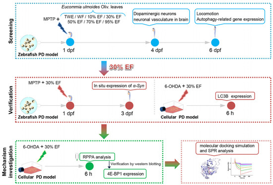 The experimental workflow chart. Zebrafish at 1 day (s) post fertilization (dpf) were exposed to MPTP and different fractions of EUOL extract. The 30% EF was identified to have the best anti-PD activity by evaluating the development of dopaminergic neurons and neuronal vasculature in the brain at 4 dpf. At 6 dpf, we monitored zebrafish behavior and tested the expression of autophagy-related genes. Then, we verified the anti-PD activity of 30% EF using the zebrafish and cellular PD model by detecting the expression of α-syn and LC3B. Finally, we investigated the underlying neuroprotective mechanism by locomotion assays, molecular docking simulation, and SPR.
