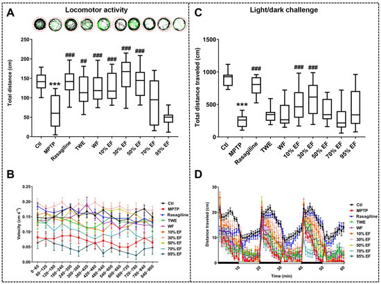 It has been reported that the loss of dopaminergic neurons in the pathophysiology of PD disrupts the supply of dopamine to the striatum, impairing motor capacity [56,57]. To compare the effect of different fractions of EUOL extract on PD-like behavior in zebrafish, we assessed the total distance and velocity traveled by the zebrafish. In the locomotor activity test and the light/dark challenge test, the total distance and velocity traveled in the MPTP-treated group were significantly reduced compared to the Ctl group, which is consistent with the previous studies (Figure 2A,C) [49]. Co-treatment with rasagiline, TWE, WF, 10% EF, and 30% EF reversed the MPTP-induced decline in the total distance traveled by each zebrafish and the corresponding average swimming speed (Figure 2A,B). In the light/dark challenge test, an apparent recovery in response to stimuli, as well as a significant increase in the total distance and velocity traveled, were observed in the 10% EF and 30% EF-treated group compared to the MPTP-treated group (Figure 2C,D), among which 30% EF showed a similar effect to that of the rasagiline group. In summary, the 30% EF effectively alleviated locomotor impairments in zebrafish, showing the optimal potential compared to other fractions.