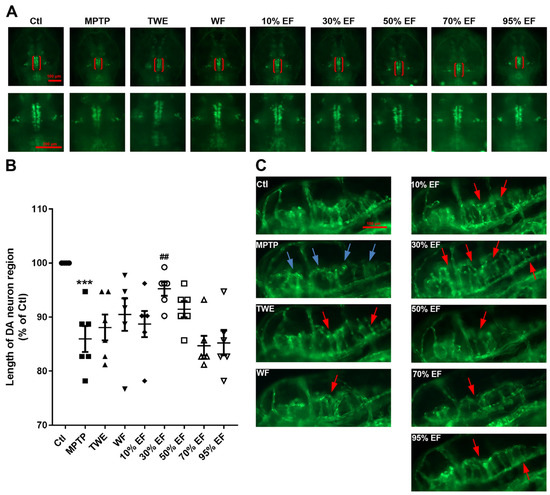 Zebrafish were randomly divided into 10 groups: Control (Ctl) group, MPTP-treated group (50 μM), positive drug rasagiline-treated group (1 mM), MPTP plus TWE fraction-treated group (50 μg/mL), MPTP plus WF extract-treated group (10 μg/mL), MPTP plus 10% EF-treated group (50 μg/mL), MPTP plus 30% EF-treated group (50 μg/mL), MPTP plus 50% EF-treated group (50 μg/mL), MPTP plus 70% EF-treated group (50 μg/mL), and MPTP plus 95% EF-treated group (2 μg/mL).