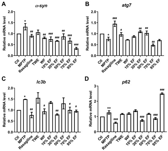 Autophagy is a critical process in the pathological mechanisms of PD, with atg7, α-syn, lc3b, and p62 being widely recognized as core regulators in the PD pathogenesis [58,59]. We observed significantly up-regulated mRNA expression of α-syn, lc3b, and p62 in the MPTP-administered group when compared to the Ctl group (Figure 4A,C,D). In contrast, rasagiline, WF, 10% EF, 30% EF, 50% EF, 70% EF, and 95% EF significantly reduced the expressions of α-syn (Figure 4A). Rasagiline, WF, 30% EF, 70% EF, and 95% EF also significantly reduced the expressions of lc3b (Figure 4C). There was a significant decline in the expression level of p62 upon treatment with rasagiline, 30% EF, 70% EF, and 95% EF (Figure 4D). We found that the transcript level of atg7 was significantly down-regulated in the MPTP group compared to the Ctl, while rasagiline, 30% EF, and 50% EF reversed this decrease (Figure 4B). By analyzing the expression of the genes mentioned above, we found that the 30% EF exhibited the best activity.