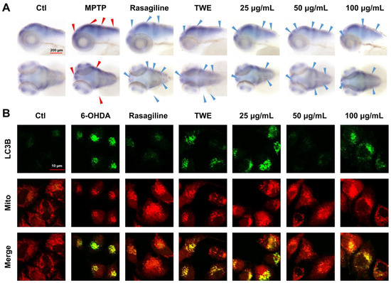 Effect of 30% EF on α-syn levels in zebrafish brains and LC3B expression in SH-SY5Y cells. (A) The expression of α-syn in the CNS of zebrafish larvae after TWE or 30% EF treatment. Red and blue arrows indicate increased and decreased expression of α-syn compared to Ctl and MPTP groups, respectively. The scale bar: 200 µm. (B) Subcellular distribution of GFP-LC3B and RFP-Mito were visualized on a confocal microscope. Scale bar: 10 μm.