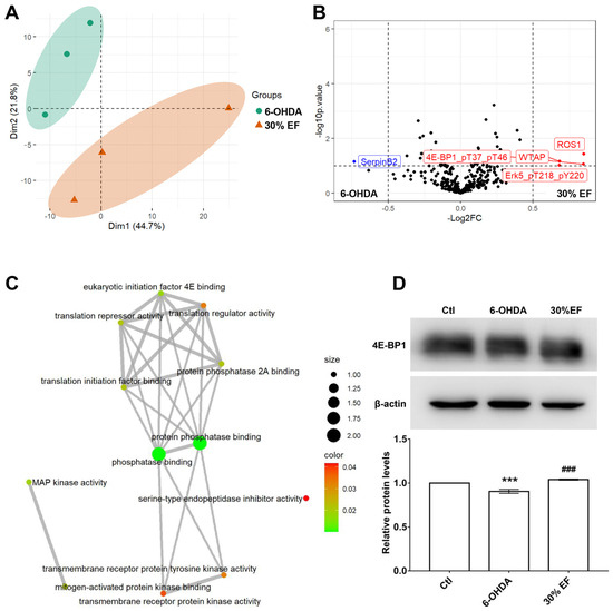 Preliminarily unveiling the underlying mechanism of the 30% EF against PD. (A) The PCA of the two datasets. Groups are labeled by different colors (green represents the 6-OHDA group; orange represents the 30% EF group). Microarray platforms are labeled by different shapes (circle represents 6-OHDA group; triangle represents 30% EF group). (B) The volcano plot shows differential protein expressions, comparing 6-OHDA vs. Ctl groups. Blue dots denote down-regulated proteins, red dots indicate up-regulated proteins, and black dots signify proteins with non-significant expression changes. (C) GO biological function analysis. (D) Western blot analysis of 4E-BP1. *** p < 0.001 vs. Ctl; ### p < 0.001 vs. 6-OHDA.