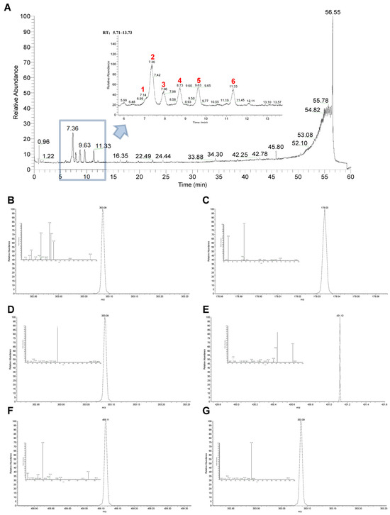 Total ion chromatograms and mass spectrogram of the main components of 30% EF using UPLC-Q-Exactive Orbitrap/MS. (A) Total ion chromatograms (peaks 1–6 correspond to the compounds shown in panels (B–G). (B–G) Mass spectrum of cryptochlorogenic acid, caffeic acid, chlorogenic acid, asperulosidic acid, asperuloside, and chlorogenic acid isomer in negative ion mode.