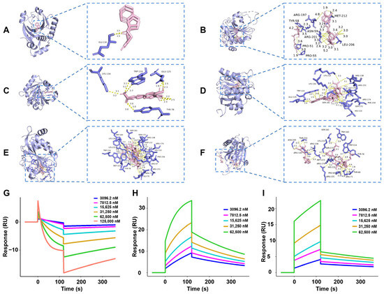 The strong binding ability of the main components in 30% EF with 4E-BP1. (A–F) The binding interaction of 4E-BP1 with rasagiline, cryptochlorogenic acid, caffeic acid, chlorogenic acid, asperulosidic acid, and asperuloside, respectively. (G–I) SPR analysis of the binding affinity of cryptochlorogenic acid, caffeic acid, and chlorogenic acid to 4E-BP1, respectively.