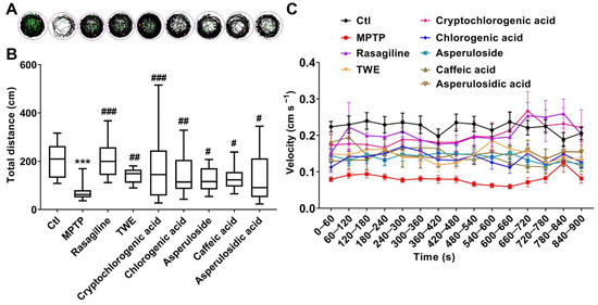 Zebrafish were randomly divided into 8 groups: Ctl group, MPTP-treated group, MPTP plus positive drug rasagiline-treated group, MPTP plus cryptochlorogenic acid-treated group (cryptochlorogenic acid, 100 μM, 150 μM, 200 μM), MPTP plus chlorogenic acid-treated group (chlorogenic acid, 150 μM), MPTP plus asperuloside-treated group (asperuloside, 150 μM), MPTP plus caffeic acid-treated group (caffeic acid, 150 μM), and MPTP plus asperulosidic acid-treated group (asperulosidic acid, 150 μM).