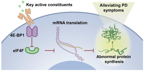In the zebrafish PD model, MPTP treatment might alter the intracellular environment, including increased oxidative stress and mitochondrial dysfunction, which caused a decrease in the expression of 4E-BP1 protein. The down-regulation of 4E-BP1 might result in increased formation of the eIF4F complex and potentially promote abnormal protein synthesis. It is worth noting that oxidative stress and mitochondrial dysfunction are also closely related to PD [83]. Some studies have shown that activating the Nrf2/Keap1 pathway can alleviate the PD-like symptoms in animal models [84,85]. In addition, mitochondrial dysfunction is another key factor in the pathogenesis of PD. Mitochondria are the main source of cellular energy production, and their dysfunction can lead to insufficient energy supply and increased production of reactive oxygen species (ROS), thereby exacerbating neuronal damage [86]. Research has found that some natural compounds can improve mitochondrial function by regulating mitochondrial autophagy, thus exerting a neuroprotective effect [87,88]. The 30% EF treatment induced the up-regulation of 4E-BP1, which inhibited the formation of the eIF4F complex, thereby suppressing the synthesis of abnormal proteins, including α-syn, a pathological feature of PD (Figure 10). This action helped maintain cellular protein synthesis balance and reduced MPTP-induced damage, thus alleviating PD symptoms.