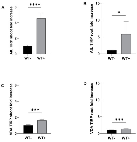 The TIRP gene expression levels in Arabidopsis wild type (WT) after Alternaria brassicicola (Alt) or Verticillium dahliae (VDA) fungal infections. Seedlings were infected at the age of 10 days. A. brassicicola was applied to a single leaf of each plant while V. dahliae was applied to the roots. After 7 days of infection, the shoot and root were separated, harvested, frozen, and used for RTqPCR analysis. The figure shows the TIRP levels (±SE) detected in (A) shoots and (B) roots upon A. brassicicola treatment and in (C) shoots and (D) roots upon V. dahliae treatment. The statistical differences were tested with Student t-test using GraphPad Prism and considered significant when p ≤ 0.05. (*) represents p ≤ 0.05, (***) represents p ≤ 0.001, and (****) represents p ≤ 0.0001. A. brassicicola treatment WT − n = 96, WT + n = 80 and V. dahliae treatment WT − n = 112, WT + n = 104, both from four independent replications. The label (+) means with fungal infection; (−) means without fungal infection.