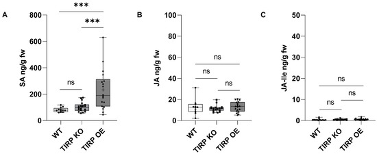 Jasmonate and salicylic acid levels in Arabidopsis WT, TIRP KO, and TIRP OE lines. Phytohormone levels (mean ± SE) were measured in 3-week-old plants without any treatment to plants. (A) Salicylic acid (SA), (B) Jasmonic acid (JA), and (C) Jasmonoyl isoleucine (JA Ile). Boxplots are shown (with center line, median; box limits, upper and lower quartiles; whiskers, 1.5× interquartile range). Statistical differences were calculated using two-way ANOVA and considered significant when p ≤ 0.05 (Tukey); ns = non-significant (p > 0.05), (***) represents p ≤ 0.001. WT n = 12, TIRP KO n = 18, and TIRP OE n = 18 from four independent replicates.