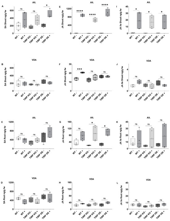 Phytohormone (SA, JA, and JA-Ile) levels in shoots and roots in fungal-infected Arabidopsis lines. Ten-day-old seedlings of Arabidopsis WT, TIRP KO, and TIRP OE lines were infected with A. brassicicola (Alt) (A,C,E,G,I,K) on leaf or with V. dahliae (VDA) (B,D,F,H,J,L) on roots. After 7 days of infection, all plant shoots and roots were separated, harvested, and analyzed for phytohormone contents before and after treatment. (A) SA in shoots (A. brassicicola), (B) SA in shoots (V. dahliae), (C) SA in roots (A. brassicicola), (D) SA in roots (V. dahliae), (E) JA in shoots (A. brassicicola), (F) JA in shoots (V. dahliae), (G) JA in roots (A. brassicicola), (H) JA in roots (V. dahliae), (I) JA-Ile in shoots (A. brassicicola), (J) JA-Ile in shoots (V. dahliae), (K) JA-Ile in roots (A. brassicicola), and (L) JA-Ile in roots (V. dahliae). Boxplots are shown (with center line, median; box limits, upper and lower quartiles; whiskers, 1.5× interquartile range). Statistical differences were calculated using two-way ANOVA and considered significant when p ≤ 0.05 (Tukey); ns: non-significant (p < 0.05), (*) represents p ≤ 0.05, (***) represents p ≤ 0.001, and (****) represents p ≤ 0.0001. A. brassicicola treatment WT − n = 96, WT + n = 80, TIRP KO − n = 84, TIRP KO + n = 92, TIRP OE − n = 88, and TIRP OE + n = 84. V. dahliae treatment WT − n = 112, WT + n = 104, TIRP KO − n = 112, TIRP KO + n = 108, TIRP OE − n = 108, and TIRP OE + n = 112 from four independent replications.