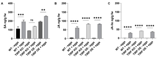 Phytohormone analysis of 5-week-old Arabidopsis WT, TIRP KO, and TIRP OE lines after treatment with S. littoralis egg extract. Eggs (approx. 100) were crushed and extract was applied on each leaf of 5-week-old plants. One single leaf per plant was treated with egg extract for 48 h and then harvested for analysis. Levels (mean ± SE) of (A) Salicylic acid (SA), (B) Jasmonic acid (JA), and (C) Jasmonoyl isoleucine (JA Ile) are shown. Statistical differences were calculated using ordinary one-way ANOVA and considered significant when p ≤ 0.05 (Tukey); ns: non-significant (p > 0.05), (**) represents p ≤ 0.01, (***) represents p ≤ 0.001, and (****) represents p ≤ 0.0001, n = 10.