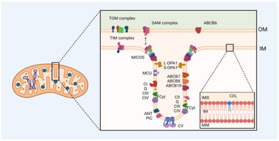 Mitochondrial membrane proteins are involved in ATP synthesis and mobilization in cardiac diseases. Mutations in the genes that encode mitochondrial proteins or damage in them result in many deficiencies in electron transfer and proton-motive force generation altering ATP synthesis and cristae structure. OM: outer membrane, IM: inner membrane, IMS: intermembrane space, MM: mitochondrial matrix, TOM: translocase of the outer mitochondrial membrane complex, TIM: translocase of the inner mitochondrial membrane complex, SAM: sorting and assembly machinery complex, MICOS: mitochondrial contact site and cristae organizing system, MCU: calcium uniporter protein, L-OPA1: dynamin-like GTPase OPA1 (optic atrophy protein 1) long form, S-OPA1: dynamin-like GTPase OPA1 (optic atrophy protein 1) short soluble form, CI: complex I, Q: quinone, CII: complex II, CIII: complex III, CIV: complex IV, Cyt: cytochrome, ANT: ATP/ADP antiporter, PiC: mitochondrial phosphate transporter, CV: complex V, ABC: ABC transporter, CDL: cardiolipin.