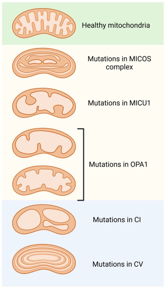 Different factors are involved in regulating mitochondrial cristae morphology. Proteins involved in cristae formation can be divided into two categories: members that are located at the junctions of the cristae (MICOS, OPA1, and MICU1) and those that are located at the tip of the cristae (ATP synthase). When these proteins are altered or modified, the morphology of the mitochondrial cristae is radically changed. If proteins located at the cristae junctions are targeted, an aberrant cristae morphology is generated, such as wider cristae junctions, a decreased cristae number, or cristae loss (Figure 2).