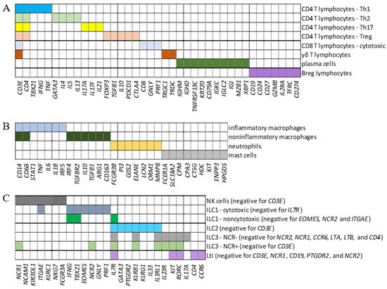 Identification of cell populations. Panels (A–C) show the combinations of genes used to identify adaptive lymphoid cells (A), myeloid cells (B), and innate lymphoid cells (ILCs) (C), respectively. Each colored segment shows the combination of genes that must be simultaneously transcribed to identify all indicated subpopulations. In the case of ILCs, the genes indicated in parentheses as negative represent a group of additional genes that must not be transcribed for this cellular classification.