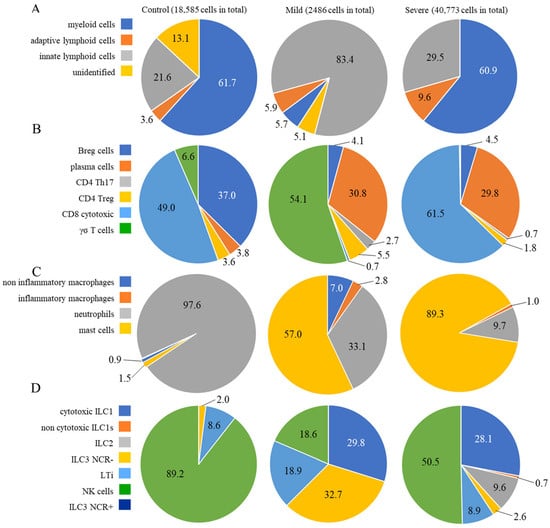 Percentages of different cellular populations among patient groups. The percentage of each cell cluster is shown in (A), and the percentages of each subpopulation per cluster are shown in the other panels. Adaptive lymphoid cells are shown in (B); myeloid cells are shown in (C); and ILCs are shown in (D). The total number of cells analyzed per group of patients is shown at the top of the figure.