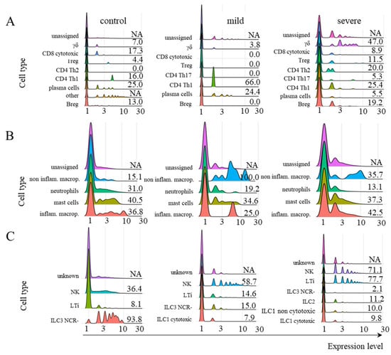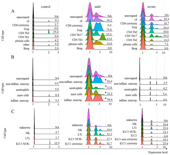 Approximately 62% of the cells from control individuals were identified as myeloid cells (Figure 2A), with approximately 21% being ILCs and less than 4% being adaptive lymphoid cells (Figure 2A), which were represented mainly by CD8+ cytotoxic T and Breg lymphocytes (Figure 2B). Regarding the prevalent population of myeloid cells, neutrophils comprised almost the entire population (Figure 2C), while NK cells were the main ILC population (Figure 2D). In mild cases, approximately 83% of the cells were identified as ILCs, with less than 6% being adaptive lymphoid or myeloid cells (Figure 2A). The main subpopulations were γσ T lymphocytes and plasma cells (Figure 2B), mast cells and neutrophils (Figure 2C), and a similar distribution of ILCs as ILC3 NCR−, cytotoxic ILC1, LTi, and NK cells (Figure 2D). In severe cases, almost 61% of the cells were myeloid cells, followed by approximately 30% ILCs and approximately 10% adaptive T lymphocytes (Figure 2A). There were CD8 cytotoxic and plasma cells (Figure 2B), and almost 90% of the myeloid cells were identified as mast cells, with approximately 10% being neutrophils (Figure 2C). Moreover, mostly NK cells and cytotoxic ILC1s were among the ILCs (Figure 2D). The predominant cellular populations found in severe cases were primarily cells with cytotoxic or inflammatory functions, which are correlated with disease severity.