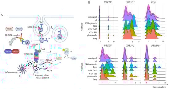 General TRIM21 pathway and its components’ transcription in adaptive lymphoid cells. Panel (A) represents the general TRIM21 pathway, where IgG-coated SARS-CoV-2 viruses invade host cells primarily by interacting with the ACE2 receptor and are enclosed in endosomal vesicles (1). Then, the virus bound to IgG must escape the endosome and reach the cytoplasm (2), where TRIM21 dimers bind to the Fc portion of IgG with high affinity. The addition of monoubiquitin is performed via UBE2W or UBE2D2, the structural base for polyubiquitination via UBE2N and UBE2V2 (3). For TRIM21-dependent virus proteasomal degradation, VCP activity is required (4), in addition to substrate deubiquitination by Poh1, which can directly activate the innate antiviral response by activating NF-κB (5). After degradation, cytoplasmic virus fragments (6), including genomic dsRNA recognized by MDA-5 and RIG-1, can also activate NF-κB (7). Moreover, nongenomic fragments of the virus can activate inflammasomes such as NLRP3 (8), all of which contribute to the production of type I interferons and inflammatory cytokines. Panel (B) shows our analysis of E2 ubiquitin enzymes UBE2W, UBE2D2, UBE2N, and UBE2V2 transcriptional levels. Moreover, Poh1 (PSMD14 gene) and VCP transcription were analyzed in adaptive lymphoid cells from COVID-19 patients with mild symptoms. Panel (B) shows the transcriptional profile of the indicated molecules in adaptive lymphoid cells from mild COVID-19 cases. The artwork was prepared using BioRender.com.