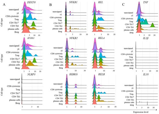 Transcription of some members of the TRIM21-dependent virus innate response. The analysis was performed for the indicated molecules in the populations of adaptive lymphoid cells obtained from mild cases of COVID-19. Panel (A) represents the transcription of danger sensors, panel (B) represents some members of the NF-κB pathway, and panel (C) shows the inflammatory cytokines TNF, IL1B, and IL18.