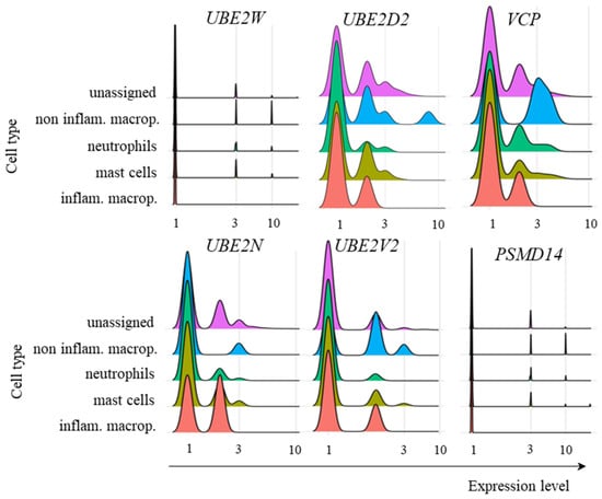 With regards to myeloid cells from patients with mild symptoms, the transcriptional profile of ubiquitin pathway members was similar to that of adaptive lymphoid cells, with no relevant levels of UBE2W transcription and variable levels of UBE2D2, UBE2N, and UBE2V2 (Figure 7). VCP was also transcribed at different levels by the cell subpopulations (Figure 7). However, PSMD14 showed no relevant transcription of any population of the myeloid cells analyzed (Figure 7). Presently, it remains unclear whether the absence of Poh1 might obstruct subsequent stages of the pathway, or whether alternative deubiquitinases would act to remove conjugated ubiquitin molecules.