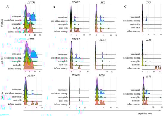 Transcription of several members of the TRIM21-dependent virus innate response in myeloid cells. The analysis was performed for the indicated molecules in the populations of myeloid cells obtained from mild cases of COVID-19. Panel (A) represents the transcription of danger sensors, (B) represents some members of the NF-κB pathway, and panel (C) shows the inflammatory cytokines TNF, IL1B, and IL18.