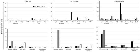 Considering the great importance of TNF, IL-1β, and IL18 in the pathogenesis of COVID-19, and in order to evaluate whether their levels were lower in mild cases than in severe cases, we analyzed their average expression levels in all groups of patients (Figure 9). In the control group, very low levels of cytokine transcription were observed in adaptive lymphocytes as well as in myeloid cells, although inflammatory macrophages and mast cells had some prominence (Figure 9). In mild cases, most CD4+ Th1 and Th17 lymphocytes transcribed TNF, with Breg cells transcribing IL18. Moreover, inflammatory macrophages primarily transcribed IL1B. As this cytokine must be enzymatically cleaved, we do not know the levels of biologically active IL-1β. On the other hand, in severe cases, comparatively higher levels of TNF were found in CD4+ Th1 cells in addition to inflammatory and noninflammatory macrophages (Figure 9), with higher levels of IL1B in inflammatory macrophages (Figure 9). The extended profile of cytokines and chemokines transcribed by adaptive lymphoid and myeloid cells is shown in Supplemental Figure S2, confirming the increased transcription of inflammatory mediators in severe cases.