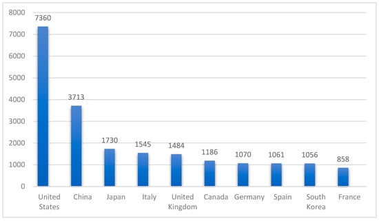 Global impact of insulin resistance research, tanking the top ten nations in terms of overall number of publications related to IR research during the period between 2002 and 2021. The numbers on the Y axis represent the number of total publications; the US is on top with 7360 publications, while France, in last place, has 858.