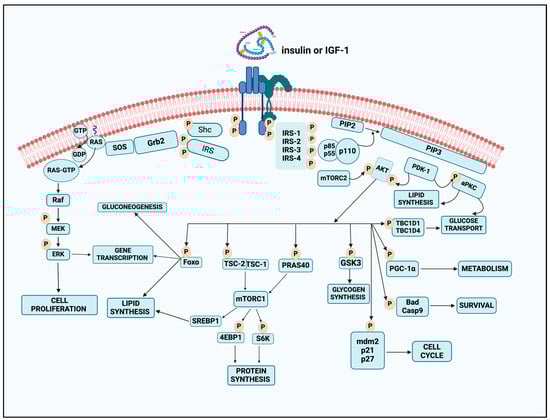 A schematic illustration of the insulin-signaling mechanism. The initiation of a chain reaction of phosphorylation events is triggered when insulin and IGF-1 receptors are activated by their respective ligand (insulin). During the process of ligand binding, the receptors undergo a conformational change and autophosphorylation. This results in the recruitment and phosphorylation of receptor substrates, such as IRS and Shc proteins. The Ras-MAPK pathway is activated by Shc, whereas the PI3K-Akt route is primarily activated by IRS proteins. This is accomplished by the recruitment and activation of PI3K, ultimately resulting in the production of the second messenger PIP3. PIP3, linked to the membrane, has the ability to recruit and activate PDK-1, which then phosphorylates and activates Akt as well as atypical PKCs. In addition to regulating glucose transport, lipid synthesis, gluconeogenesis, and glycogen synthesis, Akt is responsible for mediating the majority of insulin’s metabolic actions. Akt also regulates the cell cycle and the survival behavior of cells. The Shc-Grb2-SosRas-Raf-MAPK pathway is responsible for controlling the transcription of genes and the proliferation of cells. This image was drawn using BioRender software (https://app.biorender.com/illustrations/66fe49992ddf61bf4d5a35f6, accessed on 14 February 2025) (Science Suite Inc., Toronto, ON, Canada, DBA BioRender #2827-9028).