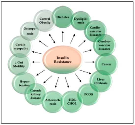 The hallmark of insulin action is the homeostasis of body glucose levels, which is achieved by different and intricate networks of reactions, as discussed above. Insulin resistance is a multifaceted pathophysiological condition, characterized by diminished bodily response to insulin, leading to increased blood glucose levels, which ultimately may manifest as T2DM and metabolic syndrome []. In humans, IR is a significant public health issue, and its link to T2DM, metabolic syndrome, and cardiovascular disease is well-established [,]. In addition to the dysglycemia, it is also associated with aberrant lipid buildup and heightened lipid catabolism in adipocytes [,]. Insulin resistance thus fosters obesity, T2DM, and its complications, including non-alcoholic fatty liver disease (NAFLD), tumors, cardiovascular disease, and other metabolic disorders [,]. As a result, IR poses a significant hazard to human health and impacts quality of life. Therefore, it is imperative to understand IR comprehensively and explore innovative therapeutic approaches to mitigate the disease burden.