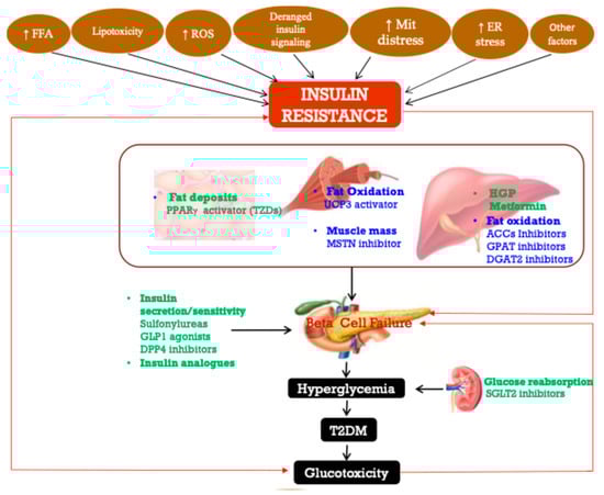 More importantly, IR and its related disorders often coexist, and patients with IR are prone to more rapid progression of these various conditions [,]. Here, we review important basic knowledge about the biochemical and molecular mechanisms that have a role in causing and maintaining IR. These mechanisms range from abnormalities in the transport of plasma glucose into peripheral microvascular endothelium, adipose tissue, and skeletal muscle to mitochondrial oxidative stress [,,]. Certain forms of IR are known to develop de novo, while others manifest themselves as part of a complex syndrome. Although the correlation between T2DM and insulin resistance is well-documented, other forms of diabetes may not exhibit this association [,].