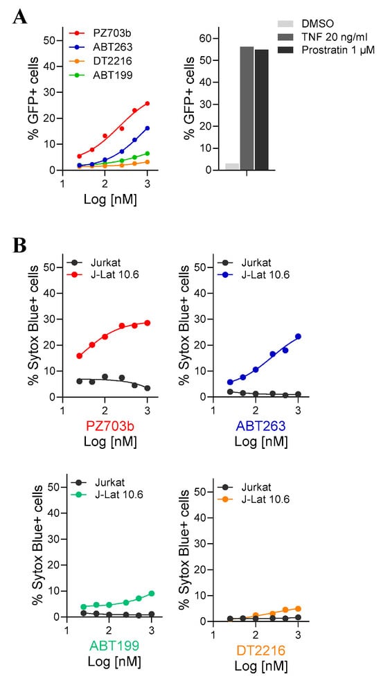 PZ703b exhibits potent HIV-1 reactivation and selective killing of J-Lat cells. Latently infected J-Lat 10.6 cells and their parental Jurkat cells were treated with serial concentrations of BCL-2/BCL-XL antagonists (PZ703b, ABT-263, ABT-199, and DT2216) for 48 h. TNF and Prostratin were used as positive controls, while DMSO served as the negative control. (A) HIV-1 reactivation was quantified by flow cytometry as the percentage of GFP-positive cells. (B) Cell death was assessed using SYTOX Blue, which is a nucleic acid dye that stains cells with compromised membranes. The percentage of SYTOX Blue-positive cells resulting from the drug’s anti-HIV effect was quantified by flow cytometry (Supplementary Figure S1) with the Jurkat cell data subtracted to isolate the effect in J-Lat cells.