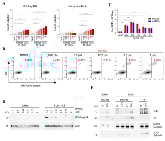 Bcl-2 and Bcl-xL have previously been implicated in the regulation of NF-kB pathway [,], which is a key target for several promising latency-reversing agents (LRAs) []. To investigate whether PZ703b activates the canonical NF-kB pathway, J-Lat cells were treated with DMSO or varying concentrations of PZ703b for 24 h, which was followed by intracellular staining for the phosphorylated p65 subunit of NF-kB and flow cytometry analysis. Treatment with PZ703b led to a significant decrease in phosphorylated p65, which typically translocate to the nucleus to initiate HIV transcription, compared to the DMSO mock control and the CD3/CD28-stimulated positive control (Supplementary Figure S2C). These results suggest that PZ703b reactivates viral latency independently of the canonical NF-kB pathway. Next, we examined the role of the non-canonical NF-kB (NF-kB2) pathway, which operates as a slow, persistent, and stimulus-selective mechanism that contrasts with and juxtapose canonical NF-kB signaling [] and could be responsible for the PZ703b-dependent transcriptional activation of HIV. To assess this, we analyzed the nuclear translocation of NF-kB2 subunits following treatment with PZ703b, using PARP1 as a nuclear fraction marker and loading control, and COX4 as a cytosolic protein control (Figure 2E). Our findings demonstrated that the NF-kB2 subunits, p52 and RELB, translocated to the nucleus after 24 h of PZ703b treatment. In contrast, TNF, known to activate the canonical NF-kB pathway, did not induce the nuclear translocation of these subunits (Figure 2E). These data suggest that PZ703b functions as an atypical latency-reversing agent (LRA), reactivating latent HIV proviruses through activation of the non-canonical NF-kB2 pathway, which may help minimize off-target effects [,]. However, further experiments, including the knockdown or knockout of NF-κB2, are necessary to confirm the role of the non-canonical pathway in PZ703b-mediated HIV reactivation. Additionally, other signaling pathways may also contribute to this effect, and these will be explored in future studies.
