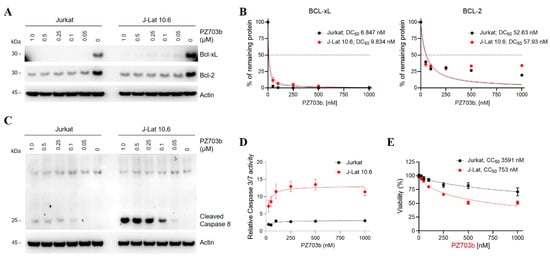 PZ703b and its sibling compound, DT2216, are newly developed PROTACs (proteolysis-targeting chimeras) that exhibit potent and safer anti-cancer properties compared to their warhead, ABT263 [,]. The target protein-binding moiety of PZ703b and DT2216 is derived from ABT263 [,], which is a dual inhibitor of Bcl-2 and Bcl-xL. Initially, it was hypothesized that both PZ703b and DT2216 could target and degrade Bcl-2 and Bcl-xL. However, previous studies have shown that both compounds specifically degrade Bcl-xL but not Bcl-2 in lymphoblast cell lines and lymphomas [,,]. This selective degradation is likely due to differences in lysine preferences and the stability of the ternary complex formed for target protein ubiquitination and degradation []. In the present study, we first assessed the degradation efficiency and specificity of PZ703b and DT2216 on Bcl-xL and Bcl-2 in Jurkat and J-Lat cell lines. As previously reported, DT-2216 induced the degradation of Bcl-xL without affecting Bcl-2 in either cell line with a similar DC50 (half-maximal degradation concentration) to prior findings [] (Supplementary Figure S3A,B). In contrast, PZ703b effectively degraded both Bcl-xL and Bcl-2 proteins after 24 h of treatment, even at a concentration of 50 nM, demonstrating superior efficacy compared to DT2216 in both cell lines (Figure 3A). The DC50 values for Bcl-xL and Bcl-2 degradation were approximately 10 nM and 50 nM, respectively, in both cell lines (Figure 3B). These results are consistent with previous findings indicating that DT2216 can only form a stable complex with Bcl-xL, while PZ703b can bind both proteins, as shown by NanoBRET assays [,]. Our data underscore the greater efficacy and specificity of PZ703b in degrading Bcl-xL and Bcl-2 in Jurkat T lymphocytes. While Jurkat cells are commonly used in leukemia research, the efficacy and specificity of PZ703b in modulating Bcl-2 and Bcl-xL levels may vary across different cell types and are independent of HIV infection.