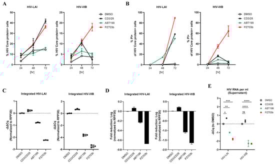 To further confirm that PZ703b selective kills latently infected cells, we extracted cell-associated DNAs to quantify integrated HIV-1 DNA and assess the impact of PZ703b on the reduction in the latent HIV-1 reservoir. Consistent with the observation that 60–80% of HIV Core-positive cells were apoptotic (Figure 5B), PZ703b treatment significantly reduced the amount of integrated HIV-1 DNA. This reduction, quantified as changes in ΔΔCq values, was normalized to the internal gene control RPP30 and the DMSO control in both virus-infected cell types (Figure 5C). This represented an approximate two-log decrease in the HIV-IIIB infected TCM cells (Figure 5D). In contrast, ABT199 only modestly reduced the HIV reservoir size in the infected TCM cells (Figure 5C,D) regardless of HIV Core protein expression levels (Figure 5A). Moreover, CD3/CD28 costimulation resulted in a slight increase in integrated viral DNA compared to DMSO controls (Figure 5C,D). Overall, these findings highlight that PZ703b has a more specific elimination effect in the TCM model of HIV latency.