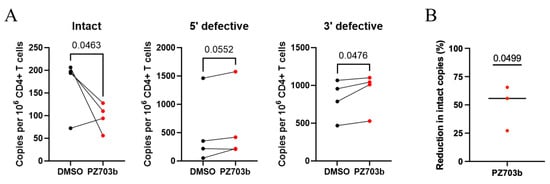 Ex vivo treatment with PZ703b reduces levels of intact HIV proviral DNA in samples from PWH on ART. (A) Frequencies of intact provirus+ CD4+ T cells (left), 5′-deleted provirus+ CD4+ T cells (middle), and 3′-deleted provirus+ CD4+ T cells (right) after treatment with PZ703b for three days. Data are reported as intact HIV-1 copies per million CD4+ T cells for each participant. Significance was determined by a one-tailed unpaired t-test. (B) The reduction in the frequency of intact provirus+ CD4+ T cells was calculated by dividing the average frequency of intact provirus+ CD4+ T cells after PZ703b treatment (left of (A)) by the frequency observed in the DMSO control. Black and red colored bullets indicate DMSO and PZ703b treatment, respectively. Data are shown as the percentage reduction (mean ± s.d.) from three out of four participants. Statistical significance was determined by one-sample t-tests against a theoretical mean of 0% reduction.