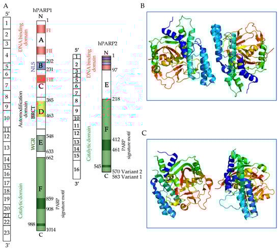 (A) A diagrammatic depiction of the protein domains and gene organization of human PARP1 and PARP2. The darkened green box inside the catalytic domain represents the region that is homologous to the PARP signature (residues 859–908 of PARP1 and 412–461 of PARP2 in variant 2) and the essential residue for polymerase activity (glutamic acid 988 of PARP1 and glutamic acid 545 of PARP2 in variant 2). Image modified from Yelamos et al. []. (B) Poly (ADP-ribose) polymerase 1 (PARP1) and (C) poly (ADP-ribose) polymerase 2 (PARP2) structures. Courtesy of Wikipedia [,]. Abbreviations: BRCT: BRCA1 C-terminus motif; WGR: domain with unknown function; FI, FII: zinc fingers motifs; FIII: zinc ribbon domain; NLS: nuclear localization signal; NoLS: nucleolar localization signal. FI and FII red-wine color denotes the zinc finger motifs; the FIII red color indicated the zin ribbon domain; the yellow color represents the BRCA1 carboxy-terminal (BRCT) motif via which PARP-1 participates in protein-protein interactions within the auto-modification domain; the green color denotes the catalytic domain, and the dark green color indicates the PARP signature motif.