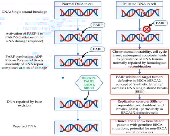 These variables may further increase the risk of breast, ovarian, or other cancers in people with BRCA mutations. DNA damage can be caused by radiation, certain compounds, and environmental contaminants []. They may not directly cause BRCA mutations, but they can accelerate the growth of cancer in cells that already have genetic predispositions or mutations. In those with BRCA mutations, leading a healthy lifestyle may help lower their chance of developing cancer in general. This includes minimizing alcohol intake, abstaining from tobacco, eating a balanced diet, and exercising often. Although studies on the impact of environmental and lifestyle variables on cancer are ongoing, there is little proof to support that they might produce BRCA1 or BRCA2 mutations on their own. Poly (ADP-ribose) polymerase (PARP) inhibitors have emerged as a promising therapeutic strategy in the treatment of breast cancer, particularly for patients with hereditary BRCA1 and BRCA2 mutations []. These inhibitors exploit the concept of “synthetic lethality”, targeting cancer cells’ reliance on PARP for DNA repair [].