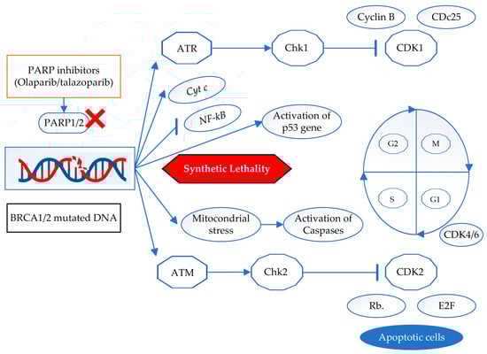 The BRCA1 and BRCA2 genes are essential for homologous recombination (HR), which repairs double-strand DNA breaks. However, this repair pathway is compromised and results in genomic instability when BRCA1 or BRCA2 is mutated. Single-strand DNA breaks are repaired by the enzymes known as poly (ADP-ribose) polymerase (PARP1/2). Talazoparib and olaparib are examples of PARP inhibitors that block PARP action, preventing single-strand break repair. The cells that have a mutation in BRCA1/2 are unable to repair the double-strand breaks caused by these lesions. The buildup of unrepaired DNA damage causes synthetic lethality, which in turn, causes cell death. During this phase, several stress response pathways are activated. Both the Ataxia Telangiectasia Mutated (ATM) and Ataxia Telangiectasia and Rad3-related (ATR) pathways detect DNA damage and initiate the DNA damage response (DDR). Activation of Chk1 and Chk2 inhibits cyclin-dependent kinases (CDK1, CDK2, and CDK4/6), leading to cell cycle arrest. The transcription factors E2F and Rb (retinoblastoma) play a role in facilitating cell cycle arrest and cell death. Apoptosis induction including p53 activation enhances apoptosis (programmed cell death), mitochondrial stress leads to cytochrome c release, which activates caspases, triggering apoptosis, and PARP inhibition disrupts NF-κB-mediated survival signaling, further promoting cell death. Ultimately, these events lead to cell death via apoptosis due to the inability of BRCA1/2-mutated cells to repair accumulated DNA damage. Abbreviations: ATM–Ataxia Telangiectasia Mutated; ATR–Ataxia Telangiectasia and Rad3-related kinases; BRCA1/2, breast cancer gene 1/ breast cancer gene 2; Chk1–checkpoint kinase 1; Chk2–checkpoint kinase 2; CDK1–cyclin-dependent kinase 1; CDK2–cyclin-dependent kinase 2; CDK4–cyclin-dependent kinase 4; CDK6–cyclin-dependent kinase 6; Cyt c–cytochrome c; NF-κB–nuclear factor kappa B; Rb–retinoblastoma; E2F–a family of heterodimeric transcription factor. Red X: Inhibition of PARP.