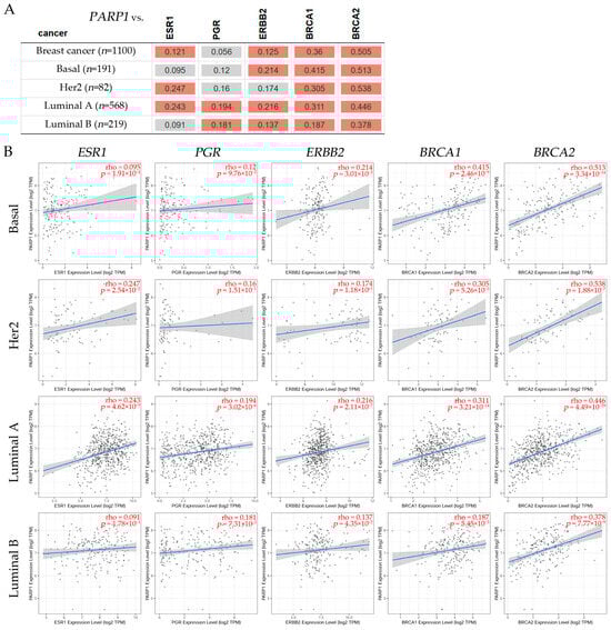 (A) The table shows the correlation between PARP1 and genes such as the estrogen receptor alpha (ESR1), the progesterone receptor (PGR), the erb-b2 receptor tyrosine kinase 2 (ERBB2), the BRCA1 DNA repair associated (BRCA1), and the BRCA2 DNA repair associated (BRCA2). The red color indicates a significant positive (Spearman’s, p < 0.05), and the gray has a non-significant correlation. (B) Representative scatter plots show the correlations (Spearman’s, p < 0.05) between PARP1 and ESR1, PGR, ERBB2, BRCA1, and BRCA2 expression levels in breast cancer subtypes such as basal, HER2, luminal A, and luminal B. These plots display linear regression lines and correlation coefficients (ρ) in red in the upper right corner. Each plot shows a blue line indicating the linear regression fit that marks the association between PARP1 and ESR1, PGR, ERBB2, BRCA1, and BRCA2 expression levels, respectively. The shaded area in grey denotes the confidence interval. Data obtained from TIMER2.0, accessed on 7 November 2024 [].
