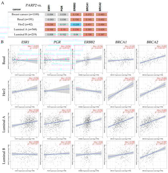 (A) The table shows the correlation between PARP2 and genes such as the estrogen receptor alpha (ESR1), the progesterone receptor (PGR), the erb-b2 receptor tyrosine kinase 2 (ERBB2), the BRCA1 DNA repair associated (BRCA1), and the BRCA2 DNA repair associated (BRCA2). The red color designates a significant positive correlation (Spearman’s, p < 0.05), blue indicated a significant negative correlation (Spearman’s, p < 0.05), and gray stands for a non-significant result. (B) Representative scatter plots show the correlations (Spearman’s, p < 0.05) between PARP2 and ESR1, PGR, ERBB2, BRCA1, and BRCA2 expression levels in breast cancer subtypes such as basal, HER2, luminal A, and luminal B. These plots display linear regression lines and correlation coefficients (ρ) in red in the upper right corner. Each plot shows a blue line indicating the linear regression fit that marks the association between PARP2 and ESR1, PGR, ERBB2, BRCA1, and BRCA2 expression levels, respectively. The shaded area in grey denotes the confidence interval. Data obtained from TIMER2.0, accessed on 7 November 2024 [].