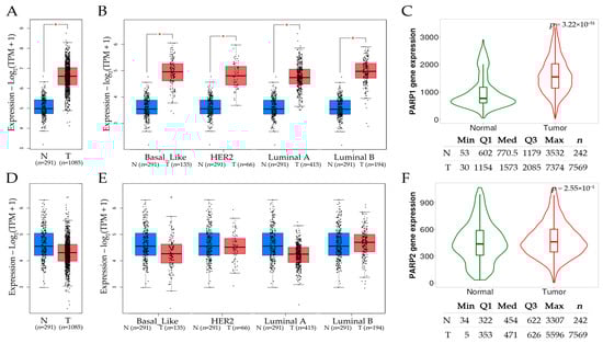 (A) Comparison of PARP1 expression in normal (n = 291) and tumor (n = 1085) tissues. (B) Expression level of PARP1 in several breast cancer subtypes such as basal-like, HER2, luminal A, and luminal B, including normal tissues. (C) Violin plot presenting PARP1 expression level with normal (n = 242) and tumor (n = 7569) tissues. (D) Comparison of PARP2 expression in normal (n = 291) and tumor (n = 1085) tissues. (E) Expression level of PARP2 in several breast cancer subtypes such as basal-like, HER2, luminal A, and luminal B, including normal tissues. (F) Violin plot presenting PARP2 expression level with normal (n = 242) and tumor (n = 7569) tissues. Data (A,B,D,E) obtained from the GEPIA2 dataset [], accessed on 7 November 2024; violin data (C,F) retrieved from the TNMplot dataset [], accessed on 8 November 2024. Abbreviations: N: normal, T: tumor * p < 0.05. The red color denotes tumor tissue and blue or green indicates normal tissue. Abbreviations, N: Normal tissue, T: Tumor tissue.