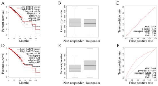 Figure 7 shows an overall survival (OS) analysis of PARP1 and PARP2 expression levels in breast cancer patients. GEPIA2 was used to explore the OS of breast cancer patients (Figure 7A,D) by analyzing data from the TCGA, GTEx, and GEO databases; the threshold values for separating the groups with low and high expression were the cut-off low (50%) and cut-off high (50%). The ROC Plotter web platform was used to assess the expression levels of PARP1/2 (Figure 7B,C,E,F, respectively) in breast cancer patients with a pathological complete response (n = 1775), treated with chemotherapy and a positive ER status.