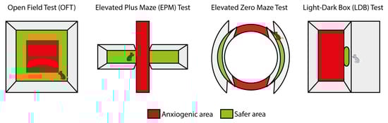 Figure 1). The open field test (OFT) involves positioning the rodent in a novel environment, i.e., an unescapable arena, where its exploratory behavior of the novel environment (horizontal and vertical activity), overall locomotor activity (total distance traveled) and the anxiety-related behavior (time spent in the anxiogenic center of the arena relative to the time spent in the safer proximity of the walls) can be assessed. The elevated plus maze (EPM) test consists of placing the rodent in an elevated cross-shaped structure with two open arms and two wall-protected arms. In this test, the time spent in the more anxiogenic open arms and the number of entries in them are reduced in animals with higher anxiety levels. A variant of the EPM test is the zero maze test, in which two wall-protected sections and two exposed sections are alternately arranged along a circular tract. Finally, the light–dark box (LDB) test involves placing the animal in an arena with two compartments, one brightly lit and open and the other completely dark and enclosed. In this test, the time spent in the more anxiogenic light compartment and the number of entries into it decreases as anxiety levels increase.