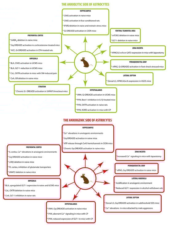 Figure 2 schematically summarizes the astrocyte observations and manipulations associated with anxiolytic and anxiogenic effects.