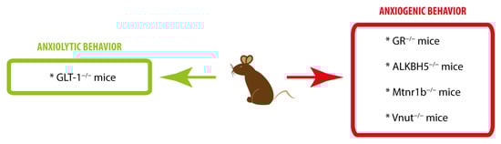 144]. Regarding anxiety, these mice displayed a decreased anxious state in the EPM test, with unaltered locomotor activity measured in the OFT. The authors used immunohistochemical analysis to confirm reduced levels of GLT-1 in three brain regions which are important for emotional regulation (PFC, striatum and hippocampus). These results are in line with the anxiolytic effect of GLT-1 deletion in VTA astrocytes [