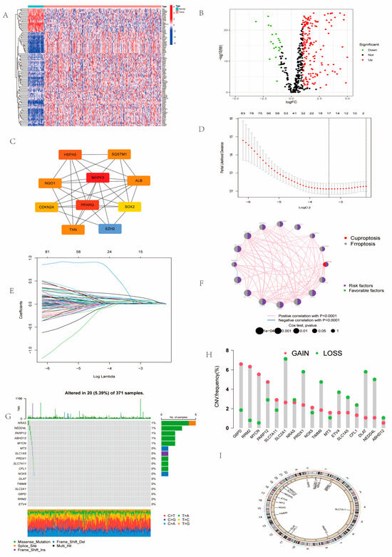 Gene alterations and expression analysis of prognostic-related CFRGs. (A) DEG heatmap based on the TCGA database. (B) Identified differentially expressed genes displayed by volcano map. (C) The top 10 genes identified by PPI network analysis of 97 prognostic genes. (D,E) 17 genes were identified by LASSO algorithm. (F,G) Prognostic networks and mutation landscape of 17 informative genes in HCC. (H,I) CNV frequencies of 17 informative genes and their location on 23 chromosomes in HCC.