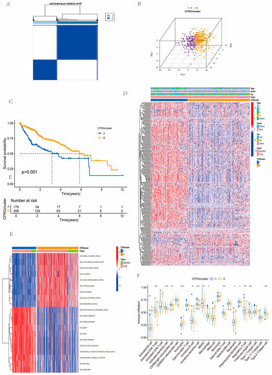 Clustering analysis of the CFRG clusters. (A) The optimal number of clusters based on the CDF curves and delta area of the cluster. (B) Two subtypes were distinguished according to PCA clustering. (C) Survival probability between two clusters. (D) A Complex heatmap displayed clinical correlations among the two CFRG clusters. (E) Comparison of CFRG clusters between A and B using the GSVA. (F) The differential analysis between immune cell infiltration for CFRG cluster A, B. * p < 0.05; ** p < 0.01; *** p < 0.001.
