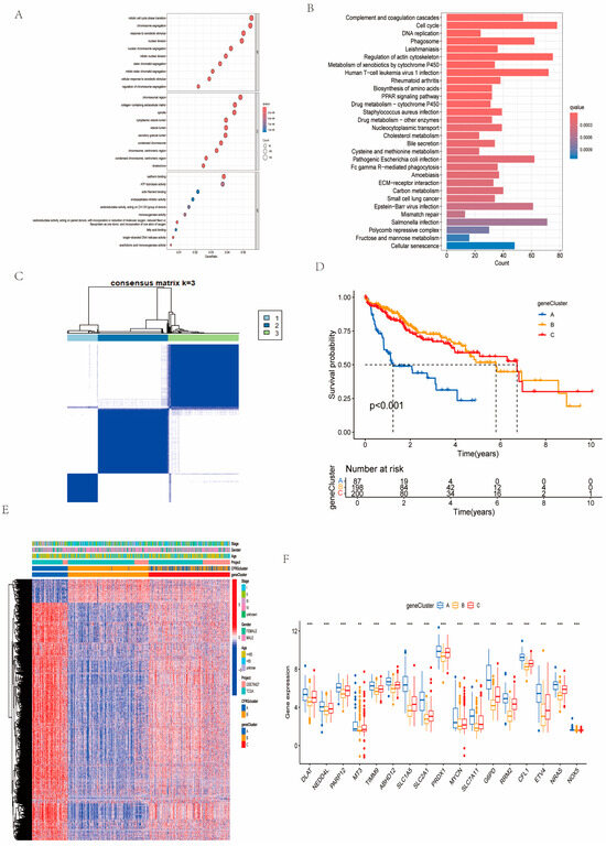 GO and KEGG enrichment analysis and clustering analysis of gene clusters. (A,B) GO and KEGG enrichment analysis of the intersecting genes. (C) Concordance matrix of identified gene cluster based on expression level of intersecting genes. (D) Survival probability of the gene clusters were compared using Kaplan–Meier survival method. (E) Expression patterns illustrated by the combined heatmap. (F) Expression pattern of 17 informative genes among the gene clusters. ** p < 0.01; *** p < 0.001.