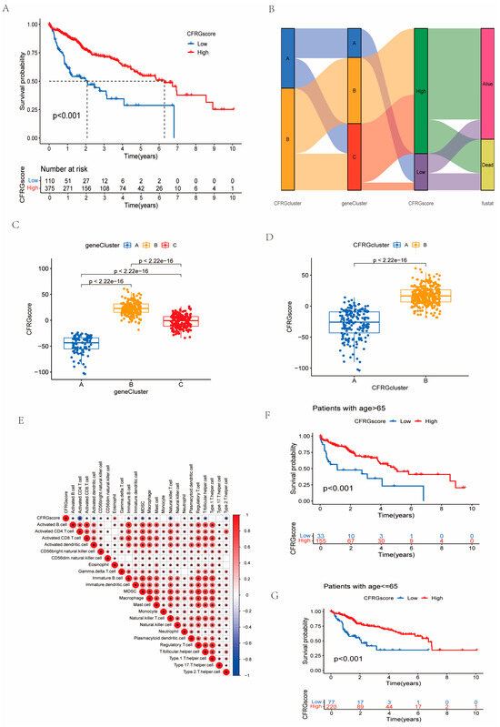 According to PCA score analysis, these samples were grouped into high- and low-CFRG-score groups. The result of the survival difference analysis revealed there were distinct differences in the two CFRG score groups (p < 0.001) (Figure 4A). Furthermore, an alluvial diagram displayed the establishment process of the CFRG score (Figure 4B). The CFRG scores showed distinct differences in the two groups classified by survival states (p < 0.01). The proportion of alive patients were higher in the high-CFRG-score group (Supplementary Figure S1). Significant differences in the CFRG score value were observed across the CFRG clusters and gene clusters (Figure 4C,D). The correlation analysis suggested that CFRG scores were negatively correlated with activated CD4.T.cell, NKT.cell, T.follicular.helper.cell, and Type.2.T.helper.cell (Figure 4E). Importantly, the CFRG score value of cluster B in both the CFRG cluster and gene clusters were the highest. We observed that for HCC patients with age > 65 and <= 65 groups, the survival probability was significantly higher in the high-CFRG-score group (Figure 4F,G).